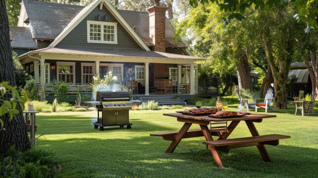BBQ grill beef steak smoke stove in the backyard during summer vacation.