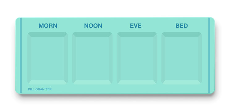 Pill box, empty pill organizer for morning, noon, evening and night, top view. Isolated vector illustration on white background.