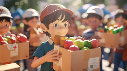3D rendering of cartoon volunteers distributing food and clothing to people in need on International Day of Charity