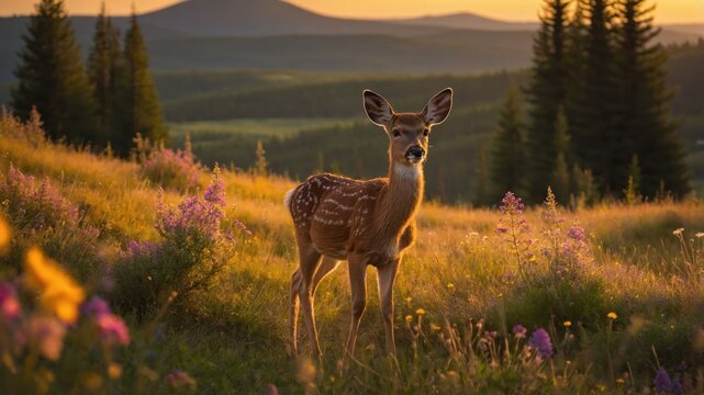 A young deer standing in a sunlit meadow filled with wildflowers, creating a serene and enchanting scene in nature.