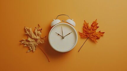 White clock on orange background with autumn leaf. summer time end and fall season coming. clock turn backward to winter time. autumn equinox. daylight saving time ends image. Equinox. Illustration