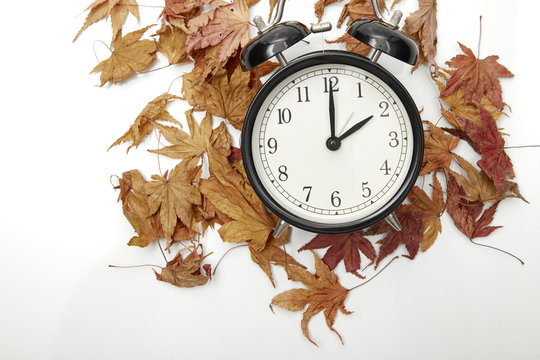 Daylight Savings Time concept, fall back in autumn, toned image. A vintage alarm clock with autumn leaves on a rustic wooden background