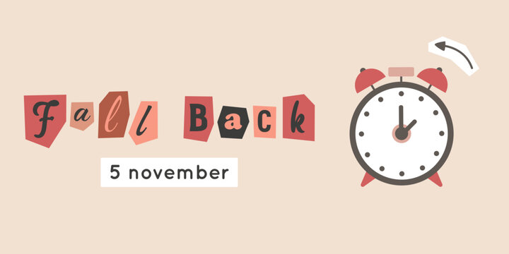 Fall back concept with alarm, collage arrow, magazine cut out text. Daylight saving time concept. Vector illustration, composite image with clock, time change reminder.