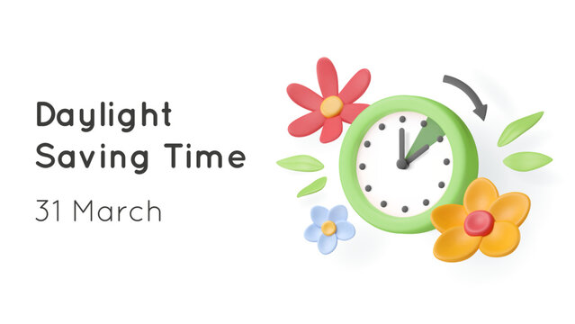 Daylight saving time summer banner. 3d vector clock render, plasticine flowers and leaves, arrow move forward. Reminder illustration with text and classic watch in plastic style. Calendar date.