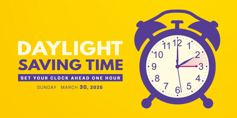 Daylight saving time. Spring Forward banner with purple alarm clock on yellow background. Text reminder to set the clock forward one hour on 30 March 2025. Vector illustration