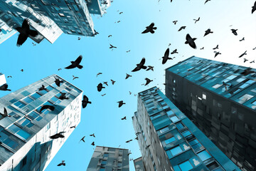 urban scene with birds flying over buidings in new york city, usa