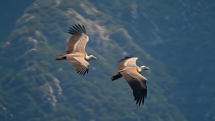 Two vultures flying over rugged mountain landscape with rocky cliffs