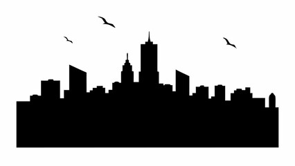 Silhouette of a cityscape with various buildings and three birds flying above the skyline at daytime