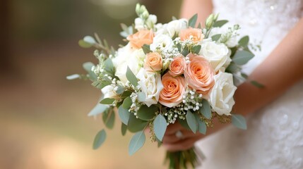 A stunning wedding bouquet featuring cream and peach roses beautifully arranged with lush greens, perfect for capturing the essence of love and celebration on a special day.