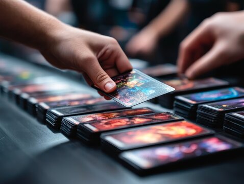 Hands exchanging trading cards at a gaming event. Multiple cards are spread on a table, showcasing colorful artwork and design details.