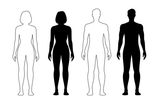 Man and woman human body silhouette, patient front view outline figure. . Isolated vector monochrome contour of male and female person shapes, standing full height. Bare and naked slim healthy people