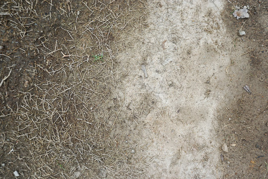Top view of ground with dead grass and old Cement floor. Background/texture.