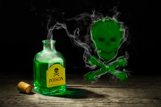 Eerie green liquid bottle with skull label, symbolizing danger and toxicity