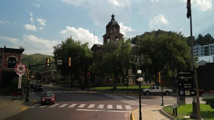 Low aerial at intersection in Deadwood South Dakota historic buildings