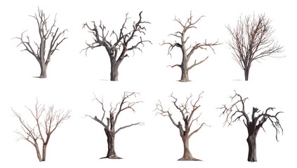 Collection of dry trees isolated on white background, deadwood silhouette, vector illustration, nature environment, autumn forest scene, woodland decay, bare branches.