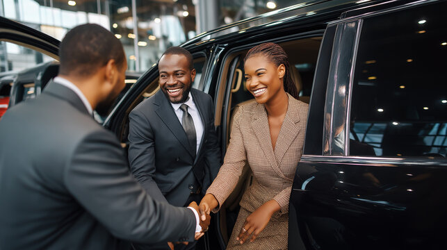 An African American couple is smiling while shaking hands with a car dealer inside a dealership. They appear excited about their new car purchase, surrounded by sleek vehicles