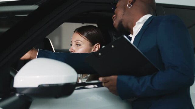 Car dealership, sales, and customer service. Caucasian car dealer sit inside vehicle with African American buyer, discussing car features. Modern business interaction focusing on buying new car.