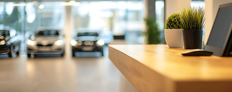 A reception desk with a plant and digital frame in focus, while a blurred row of cars in the background creates a modern dealership ambiance