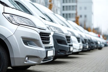 Row of vans parked in a dealership lot