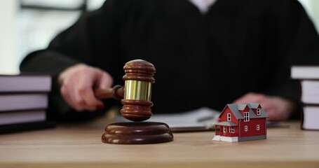 Judge knocks judge wooden gavel on background of house. Seizure of debtor property