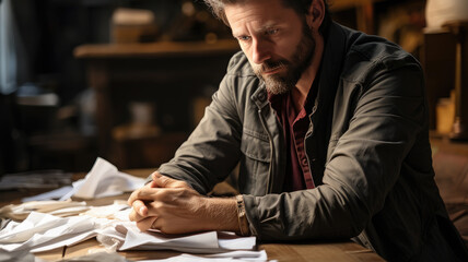 Generative AI, upset sad anxious man sitting at a desk littered with crumpled sheets of paper, deadline, stress, creative pangs, tax reporting, businessman, loan, disappointment, depression, office