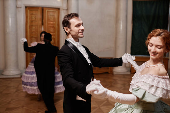Portrait of smiling gentleman wearing classic tailcoat dancing with young lady during debutante ball in palace, copy space