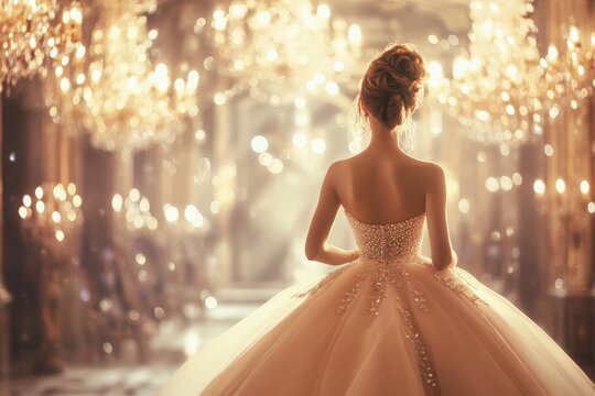 Elegant Debutante: A graceful debutante in a pale pink ball gown, attending a grand gala in an opulent ballroom with crystal chandeliers and soft lighting