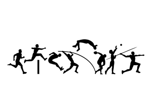 back two decathlon athletes running sprint race track, summer athletics championships at stadium