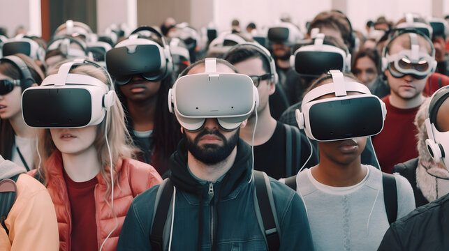crowd of deceived people in vr glasses, generative ai