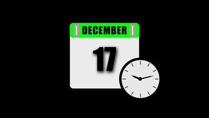 Calendar displaying December 17th day with a clock and 24 hours counting the current time on a dark background.