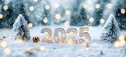 12. "A charming New Year is scene with 2025 in elegant typography, surrounded by a snowy winter landscape and festive holiday lights