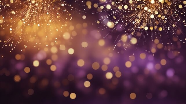 New year celebration with gold and violet fireworks and bokeh effect. Abstract holiday background with copy space.
