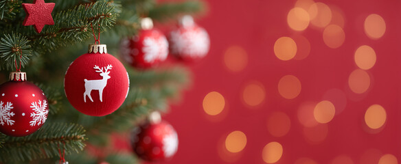 Christmas tree branch with red ornaments featuring reindeer and snowflake designs. Festive holiday background with red bokeh for new year. Banner with copy space for text