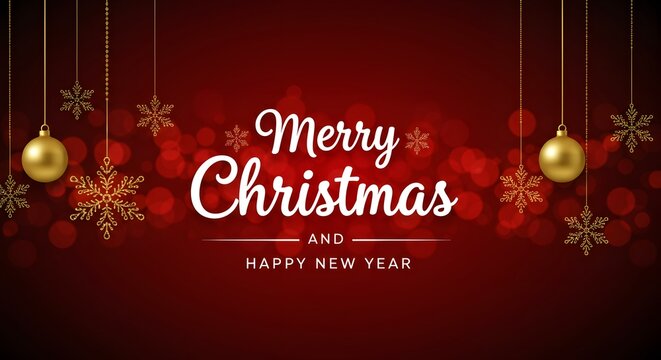 Elegant merry christmas and happy new year greeting with gold ornaments and snowflakes on a festive red bokeh background