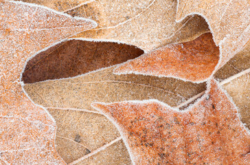 Autumn leaves with snowy landscape and open space. Empty space for text. Generative Ai