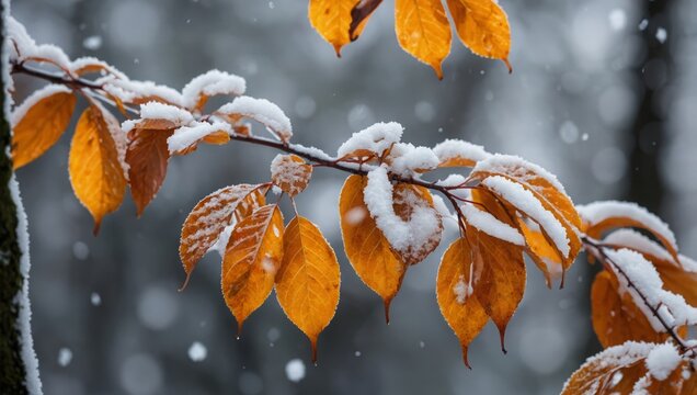 first snow on autumn leaves, frost