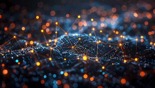 Blockchain technology abstract. Futuristic network of blockchain nodes with illuminated connections on digital landscape, dark background.