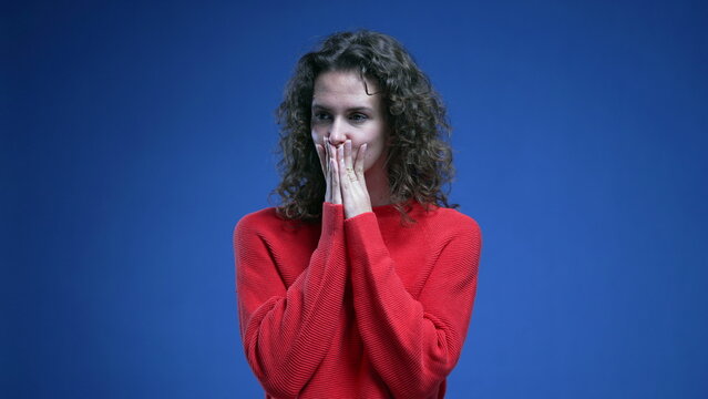 Pensive woman struggling with dilemma standing on blue backdrop with red sweater. Thoughtful 20s person during tough decision making