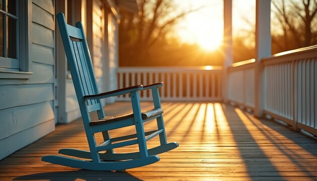 Light blue rocking chair rests on wooden porch at golden hour. Warm sunbeams cast long shadows across deck. Peaceful scene evokes quiet solitude and rustic charm.