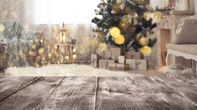 Empty wooden table in room decorated for Christmas, bokeh lights. Space for design
