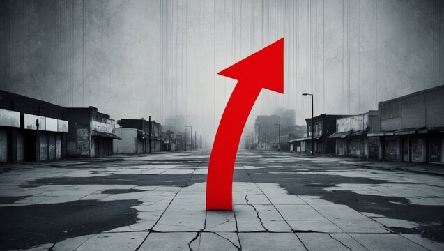 A somber scene of an economic recession with a red arrow symbolizing decline.