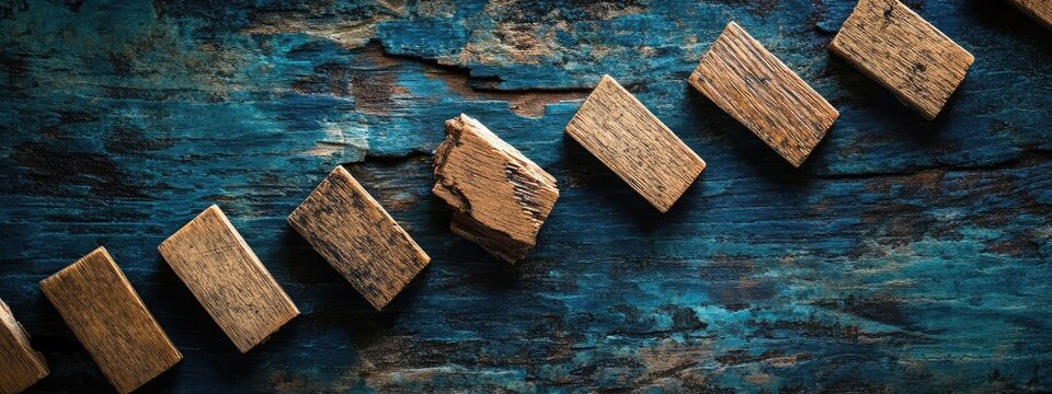 Domino Effect Illustration of Financial Decline with Wooden Dominoes on Textured Blue Background and Empty Copy Space for Business Concepts