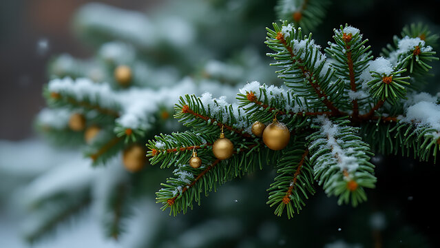 A fragrant Christmas tree branch is adorned with a garland as snow falls gently around it