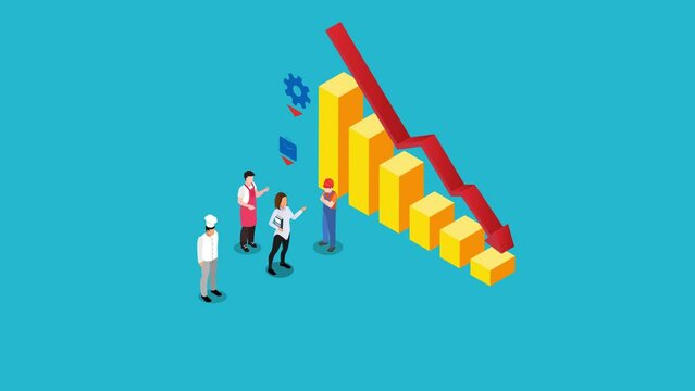 Illustrated bar graph with downward trend arrow depicting economic decline