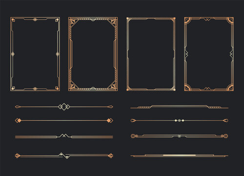 Vector set of art deco line frames, gold gatsby design, package, cards. Geometric vintage floral graphic, artdeco texture ornament