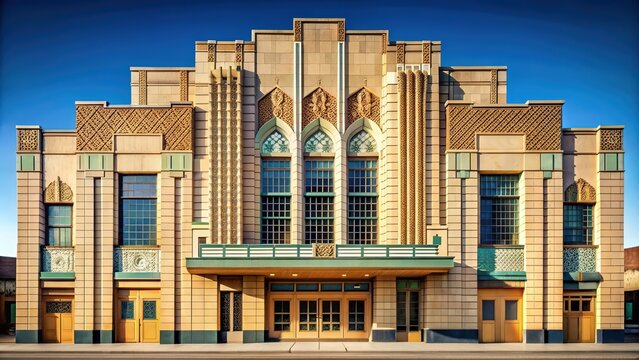 Art Deco theater building with geometric shapes and intricate details , architecture, 1930s, 1940s, art deco