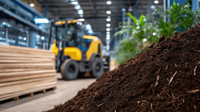 Detailed view of a large pile of organic material in indoor composting plant, close-up textures of decomposing matter, warm artificial lighting highlights surface, machinery and wo