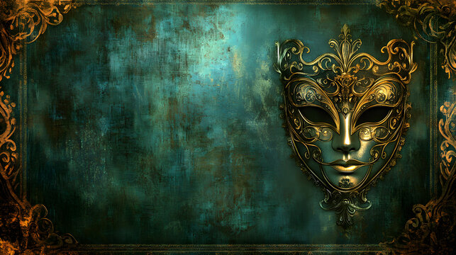 Elegant gold Venetian mask on a dark teal grunge background with ornate gold frame. Perfect for masquerade, mystery, or luxury themes.