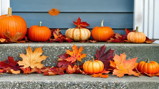 Bright orange pumpkins and colorful autumn leaves decorate stone steps, creating a warm and inviting fall atmosphere perfect for the season