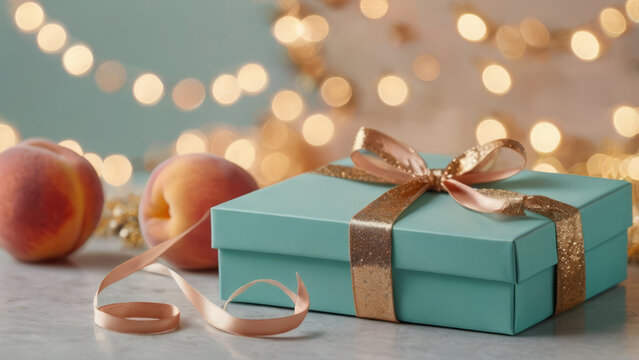 Concept for christmas and new year medical banner.Female doctor in white coat,stethoscope holds gift box with red bow in her hands against background beautifully decorated Christmas tree.Copy space